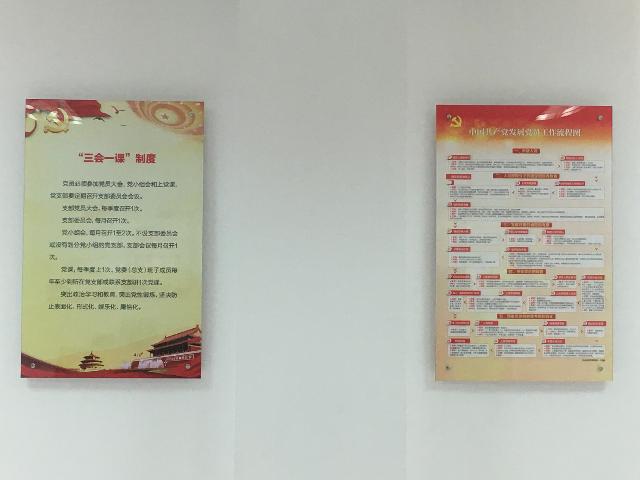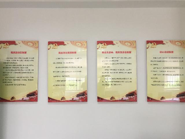 黨員活動(dòng)室在醒目位置特設(shè)主題教育墻,包括黨旗、入黨誓詞、黨員義務(wù)和權(quán)利;顒(dòng)室內(nèi)有8個(gè)宣傳展版,內(nèi)容包括組織架構(gòu)圖、黨委委員崗位職責(zé)、紀(jì)委委員崗位職責(zé)、民主生活會(huì)組織生活會(huì)制度、“三會(huì)一課”制度、民主評(píng)議黨員制度、發(fā)展黨員工作流程圖和黨員活動(dòng)日制度;顒(dòng)室還配備了報(bào)刊書(shū)架,擺放黨員學(xué)習(xí)書(shū)刊雜志等。