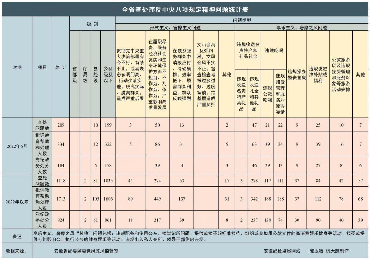 2022年上半年,全省紀檢監(jiān)察機關共查處違反中央八項規(guī)定精神問題1118起,批評教育幫助和處理1713人,其中給予黨紀政務處分924人,同比分別下降20.2%、11.4%、9.4%。