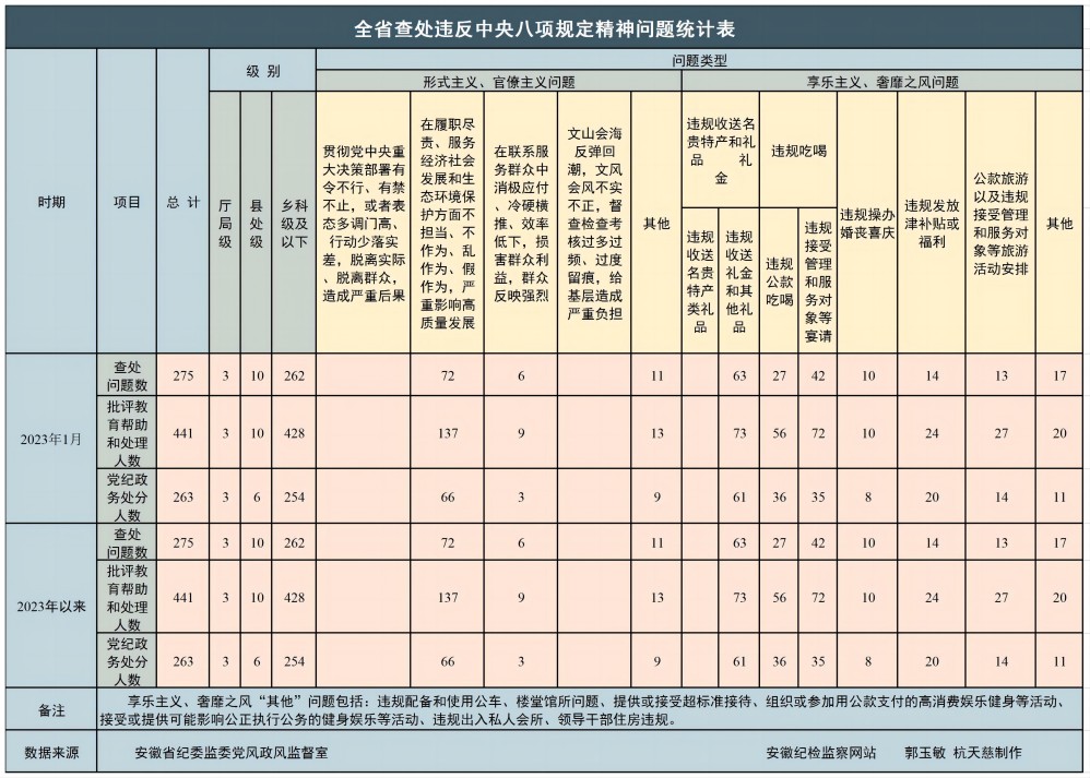 2023年1月,全省紀(jì)檢監(jiān)察機關(guān)共查處違反中央八項規(guī)定精神問題275起,批評教育幫助和處理441人,其中給予黨紀(jì)政務(wù)處分263人,同比分別上升66.7%、70.9%、77.7%。